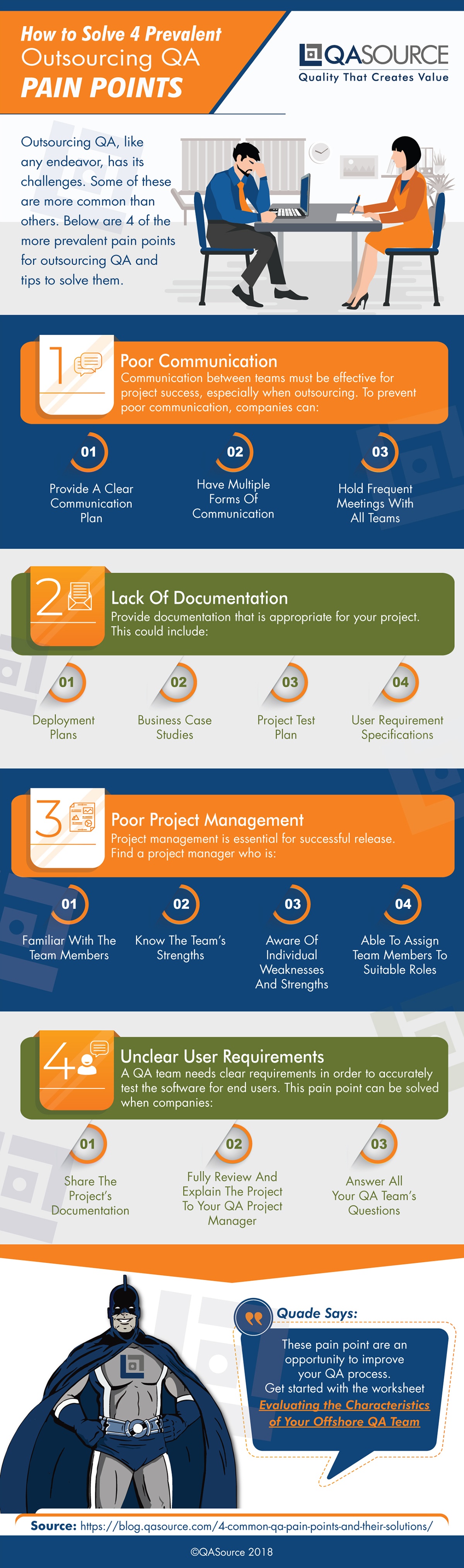 Check out QASource’s latest infographic below to read our expert engineer's tips on how to solve the 4 most prevalent pain points of outsourcing QA: