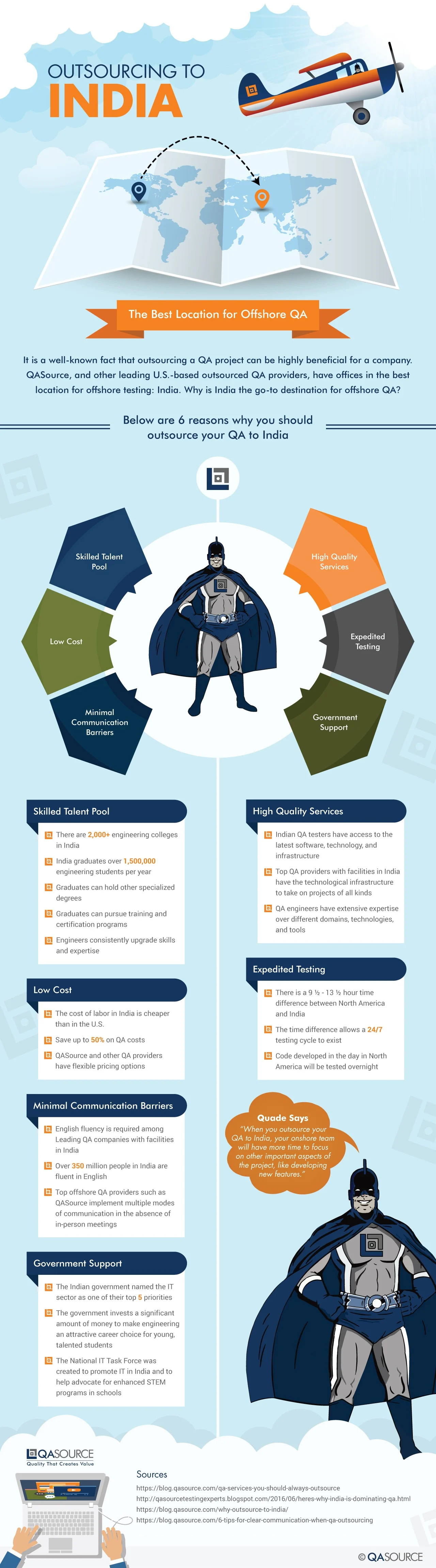 For years, India has been the go-to-destination for offshore QA. Many leading U.S.-based software testing companies, including QASource, have made India home to their testing facilities. In our latest infographic, QASource breaks down the top 6 reasons why outsourcing to India makes the best business sense.